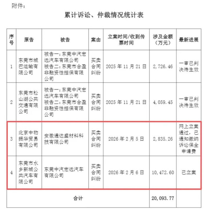 其中,2月6日,东莞市水乡新城公共汽车有限公司向中汽宏远提起诉讼,涉案金额1.05亿元,法院已立案,或与上述“电池翻车”案有相关。