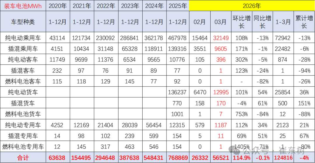 能源电板装车的需求增长是超强增速的。2019年需求增长10%;2020年内销车型能源电板装车64GWh,需求增长2%;2021年能源电板装车155GWh,需求增长143%;2022年装车295GWh,需求增长91%;2023年装车388GWh,需求增长32%;2024年锂电板装车548GWh,同比增长41%;2025年锂电板装车770Wh,同比增长40%。2026年3月锂电板装车56.5Wh,同比下降0.1%。