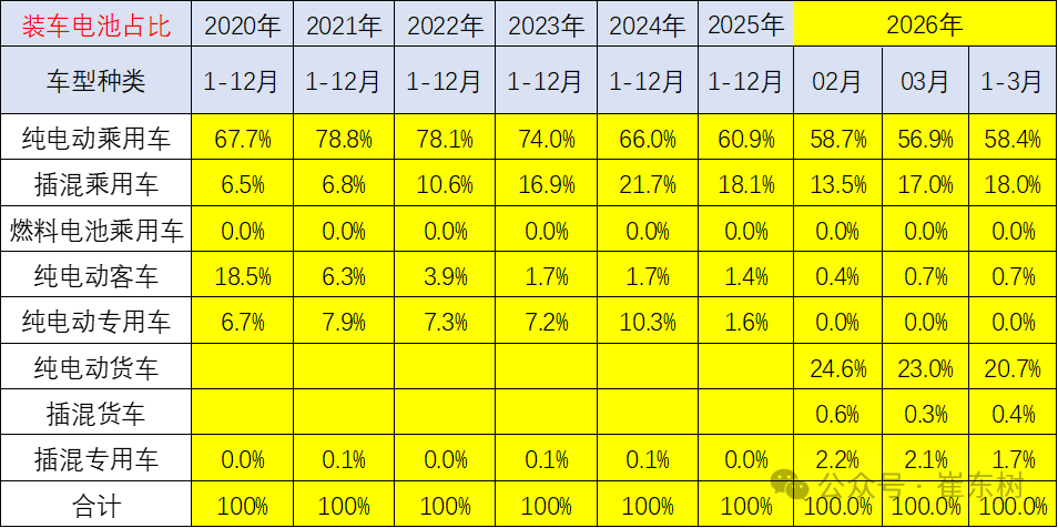 2026年1-3月的电板装车增长下降4%,其中商用车增长较强,尤其是3月的纯电动货车猛涨54%,而插混专用车增长51%。