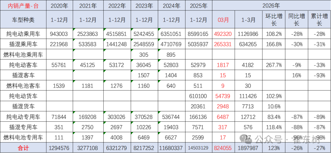 2026年3月新能源车国内市集的装车82万台、同比下降26%,其中纯电动乘用车49万台、同比下降28%;插混乘用车26.5万台、同比下降30%;纯电动货车5.5万台,这么的产量数据分化严重。