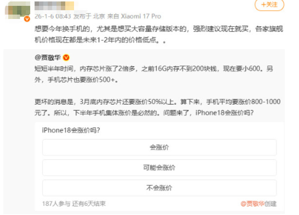 近日,有博主发文分享了一则消息,称3月底内存芯片还要涨价50%以上。有业内人士称今年换手机的,尤其是想买大容量存储版本的,强烈建议现在就买,各家旗舰机价格现在都是未来1-2年内的价格低点。