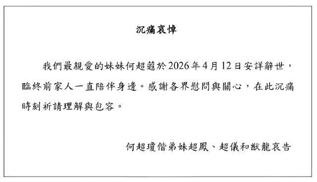 出头的全是二房同族姐弟:大姐何超琼、二姐何超凤、妹妹何超仪、弟弟何猷龙。五东说念主联名发讣告,策划后事,一个都没缺席。