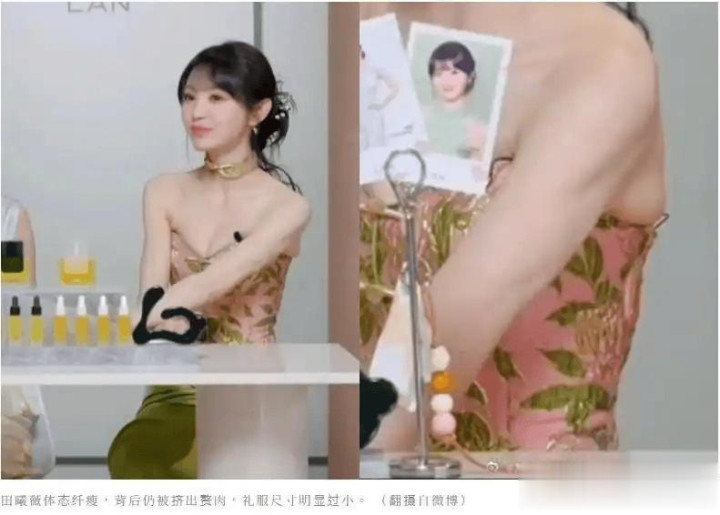 但这个事其实也不可怪田曦薇,因为其时团队准备的旗袍太小了是XS码,而田曦薇就算再瘦亦然168的高妹,是以全程被勒得胸口紧绷、副乳挤出、后背全是褶皱,全程频频拉扯调度。