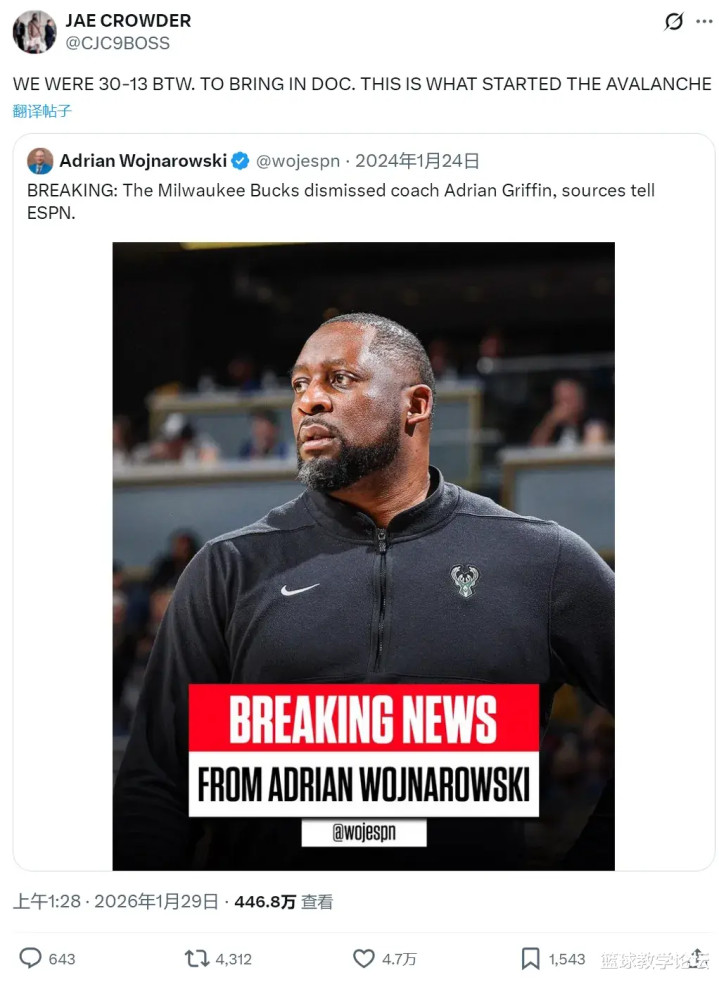 克劳德往事重提,威斯人让里弗斯尽头莫名,老里恢复:“克劳德对我方在雄鹿的上场技术动怒。”教主帮各人捋一捋,2023年夏天,字母哥指定阿德里安-格里芬担任雄鹿主帅。2024年1月格里芬被罢免,那时雄鹿30胜13负高居东部第二。