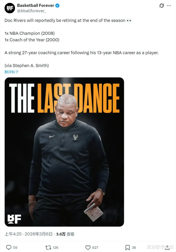 北京技术3月6日,NBA有名评述员A-史姑娘在播客节目中显现,雄鹿主帅说念格-里弗斯将在本赛季范畴后退休,范畴长达27年的合手教活命。A-史姑娘说说念:“里弗斯不会再合手教了,此次是果真范畴了,本年夏天他就要退下来了。”