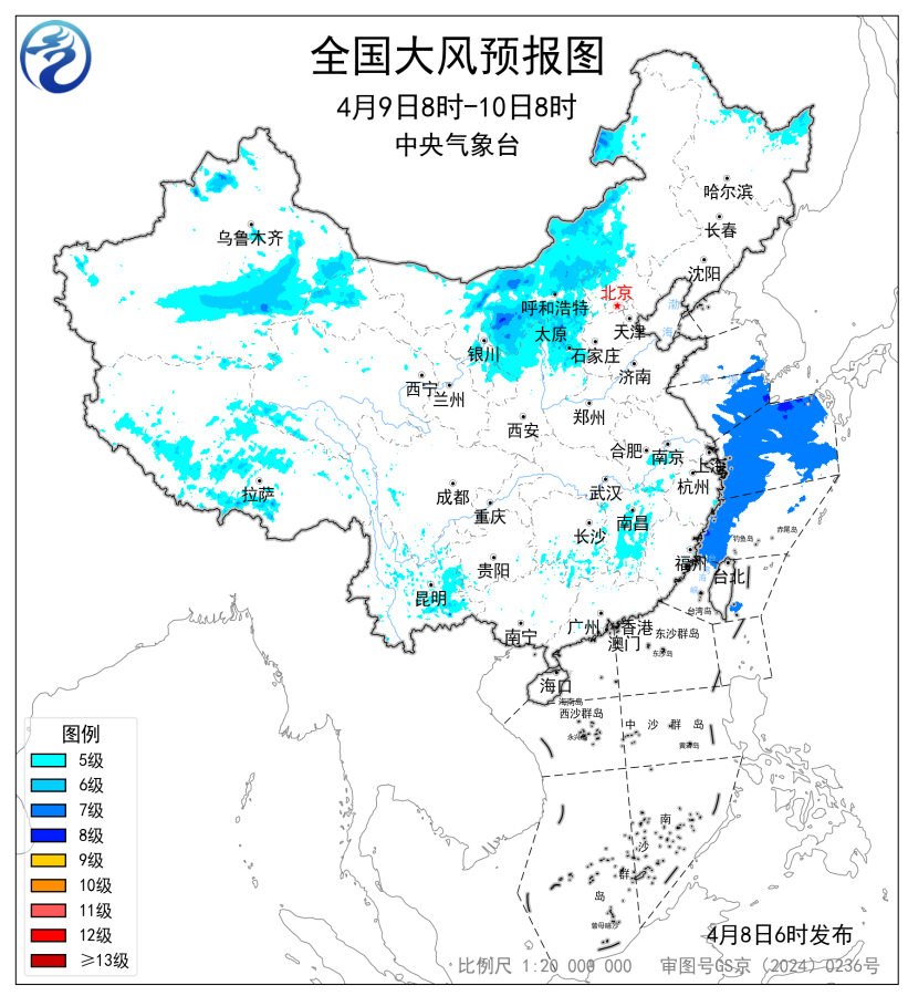中央怡悦台4月8日6时络续发布大风蓝色预警: