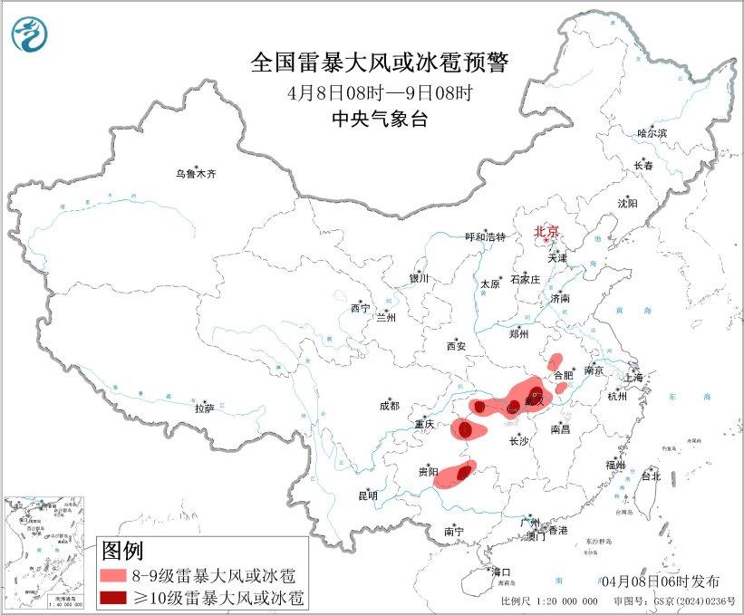 中央怡悦台4月8日6时络续发布强对流天气蓝色预警:
