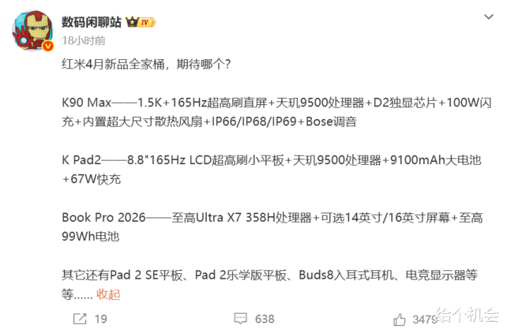 这次红米的重磅家具有红米k90 max手机、红米k pad 2平板电脑,两款机型都秉承天玑9500解决器,并领有165Hz高刷,走极致电竞阶梯,很合乎性价比党和游戏党的需求。