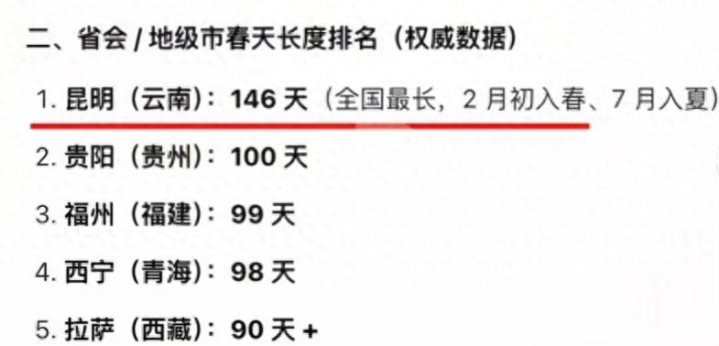 第别称是昆明,每年有146天属于春天,第二名是贵阳,每年有100天是春天;