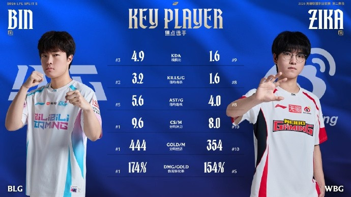 2026LPL第二赛段于今,出发选手Bin与Zika数据对比如下。