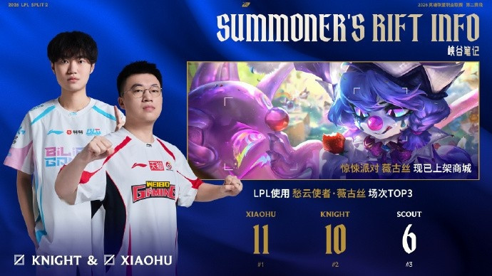 LPL使用薇古丝场次TOP3的选手如下,其中xiaohu以11次选择位列第一,澳门威斯人appKnight以10次使用位列第二;